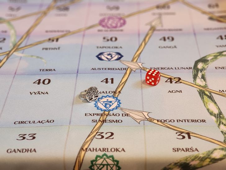 The board with 72 houses representing states of consciousness, a die, a totem with your energy and setting an intention to the game.